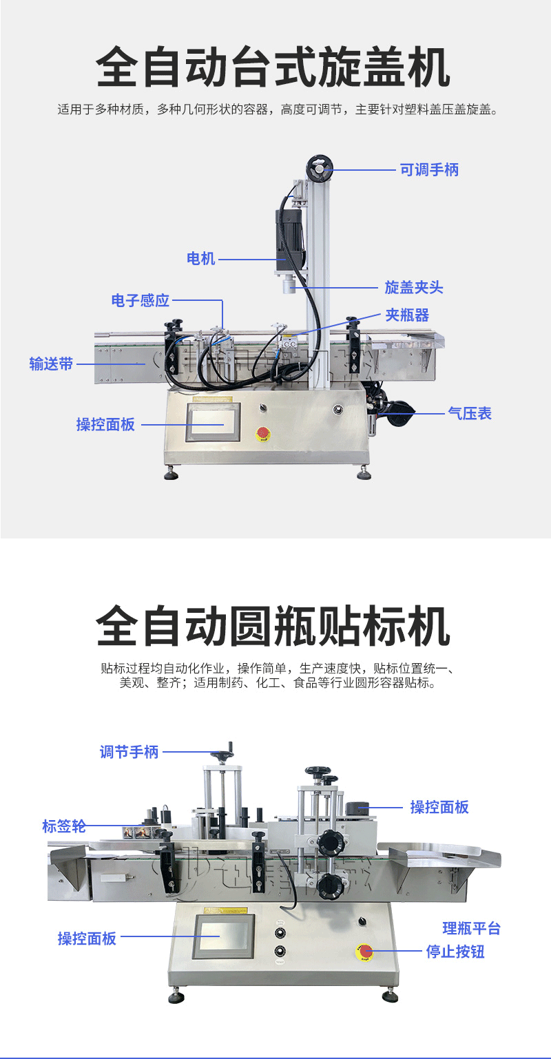 產(chǎn)品說(shuō)明:桌面型膏液灌裝生產(chǎn)線(xiàn)根據(jù)灌裝范圍選擇型號(hào),灌裝部分為雙頭下潛式灌裝機(jī),適用于不同物料不同瓶子的灌裝,配備自動(dòng)壓蓋機(jī)和圓瓶貼標(biāo)機(jī),可實(shí)現(xiàn)不同蓋子的旋蓋貼標(biāo)工作。