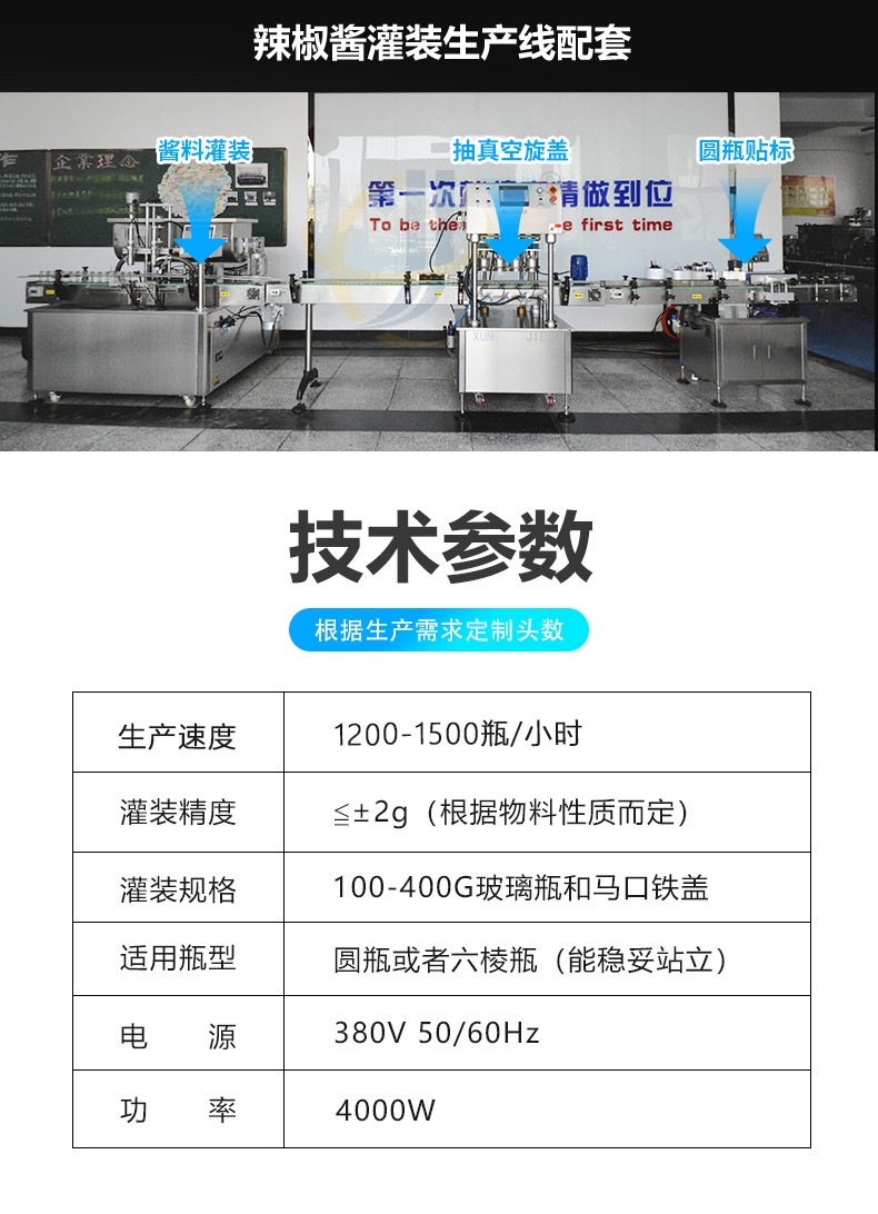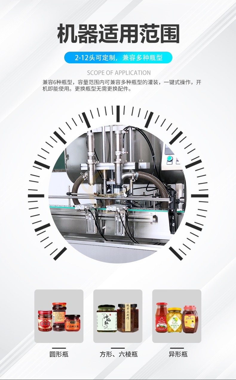 全自動(dòng)雙頭醬料灌裝機(jī)兼容6種瓶型,容量范圍內(nèi)可兼容多種瓶型的灌裝,一鍵式操作,開(kāi)機(jī)即能使用。更換瓶型無(wú)需更換配件。