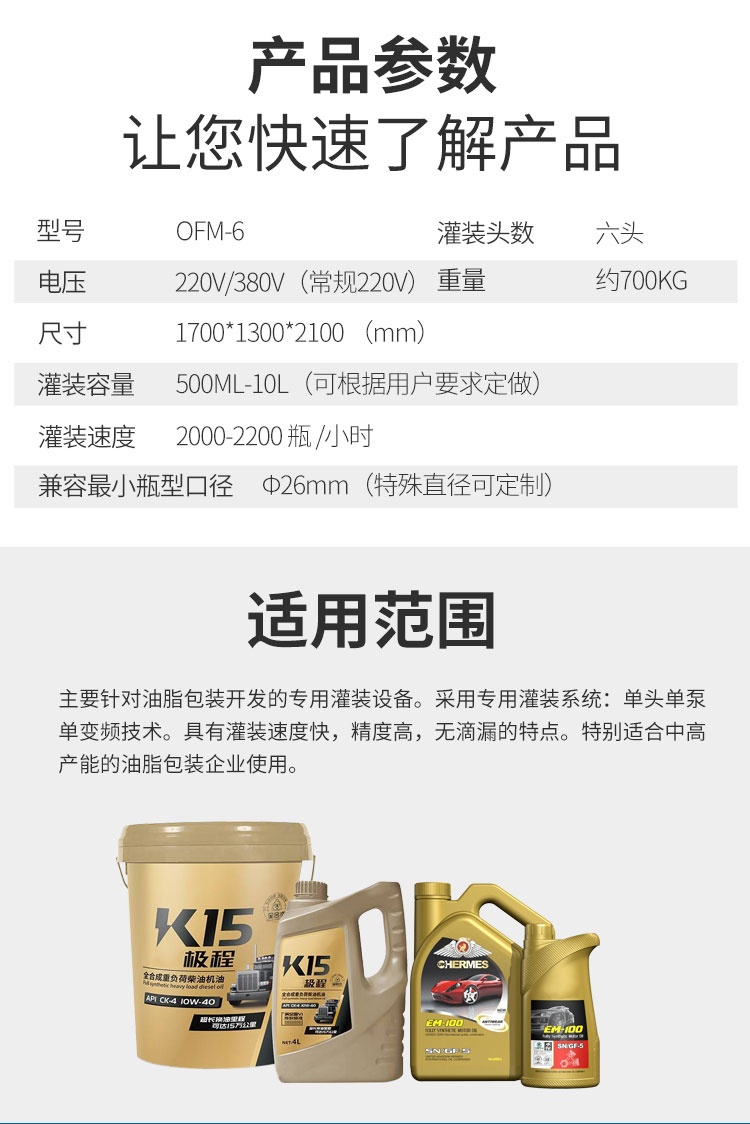 全自動六頭稱重潤滑油灌裝機(jī)主要針對油脂包裝開發(fā)的專用灌裝設(shè)備。采用專用灌裝系統(tǒng):單頭單泵單變頻技術(shù)。具有灌裝速度快
