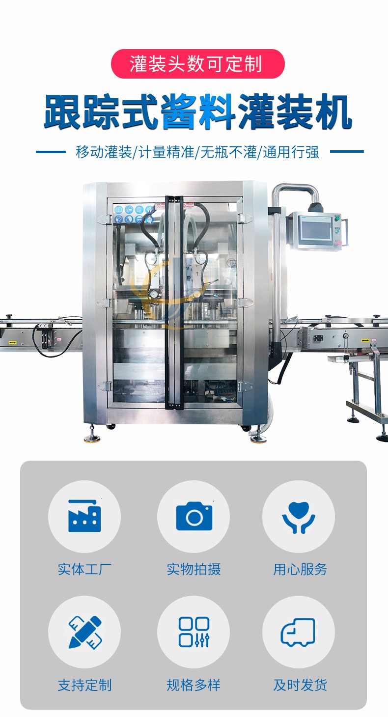 跟蹤式調(diào)味醬灌裝機(jī)設(shè)備配置定量灌裝、定液位灌裝兩種方式,計量誤差2克。定量灌裝保證每一瓶的灌裝質(zhì)量。