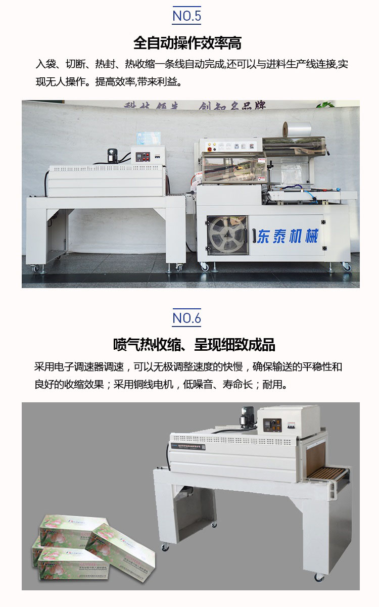 自動(dòng)塑料膜熱收縮包裝機(jī)結(jié)構(gòu)緊湊占地面積小,非常適合配套自動(dòng)包裝流水線(xiàn)完成產(chǎn)品的自動(dòng)無(wú)人化包裝,適合于單個(gè)物品包裝或有底托物品包裝。自動(dòng)送膜打孔裝置和手動(dòng)調(diào)節(jié)的導(dǎo)膜系統(tǒng)以及手動(dòng)調(diào)節(jié)的進(jìn)料輸送平臺(tái),可適于不同寬度和高度的產(chǎn)品,實(shí)現(xiàn)一臺(tái)機(jī)器滿(mǎn)足各種尺寸的包裝物品。