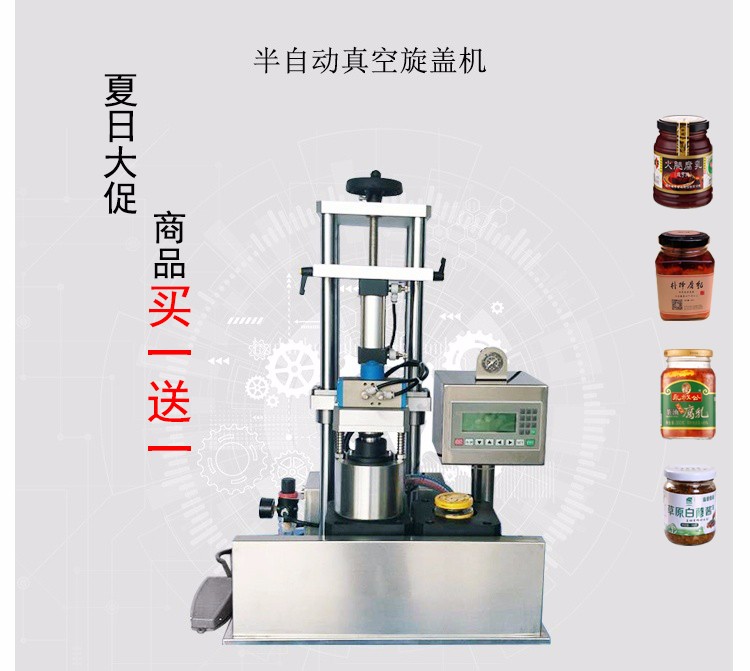 這款小型辣椒醬封口機(jī)主要用于食品包裝,采用標(biāo)準(zhǔn)馬口鐵爪式旋開蓋封口的玻璃瓶包裝??蓪?shí)現(xiàn)的功能是抽吸包裝容器內(nèi)的空氣使其達(dá)到設(shè)定的負(fù)壓值(即抽真空),然后旋緊蓋子。 為半自動機(jī)型,即人工進(jìn)出瓶,人工配蓋,其他過程自動。